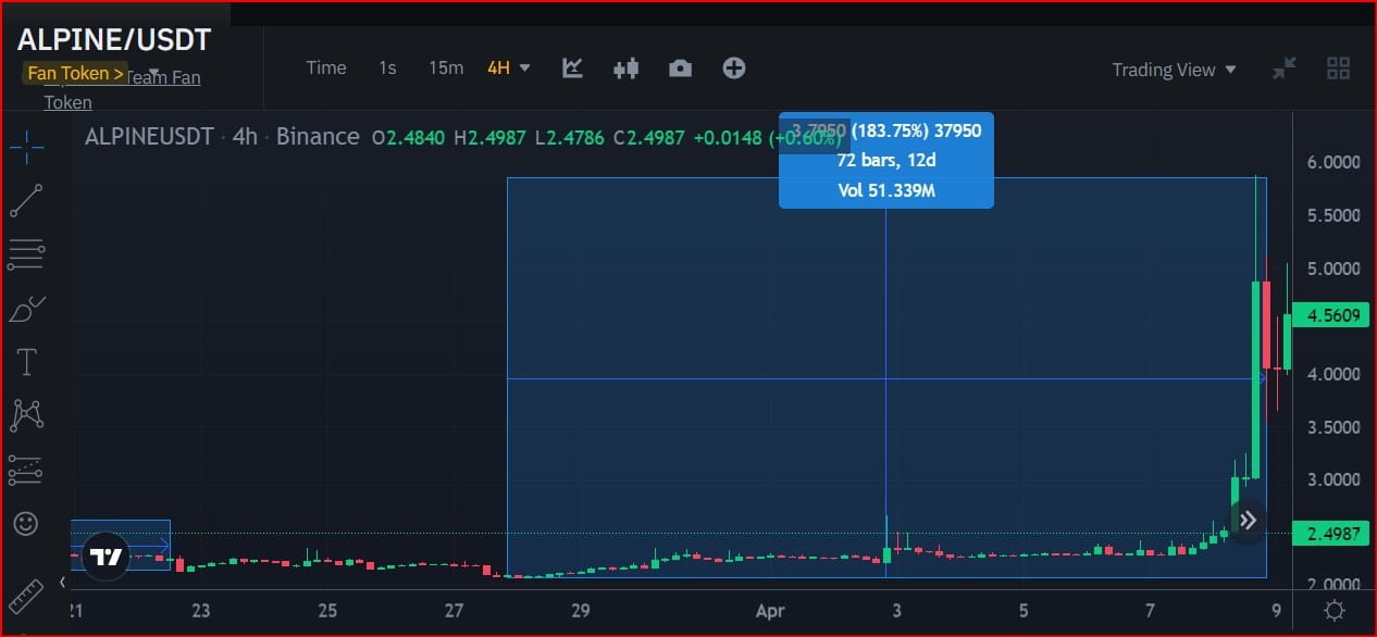 E a seguir, no dia 28 de MARÇO de 2023, o par de CRIPTOMOEDA ALPINE/USDT saltou 183%, sendo negociado de $ 2,0653 para $ 5,8603 em 12 dias. E a maioria dos membros da nossa Comunidade de Negociação de Criptomoedas transformou $ 500 em mais de $ 1.500 em 12 dias.
