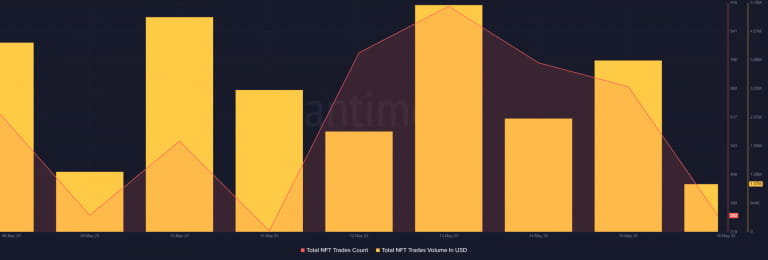 O gráfico de Santiment também indica uma tendência de crescimento semelhante. De acordo com os dados, o número de transações NFT e o volume de negociação em dólares americanos no Polkadot aumentaram significativamente na semana passada, o que parece otimista.