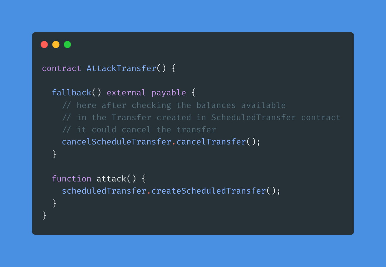 Aqui, o invasor estaria chamando a função no contrato ScheduledTransfer que após atender às condições enviaria o Ether especificado para o contrato AttackTransfer que, portanto, entraria na função de fallback e, portanto, “cancelaria” a transação do ponto de origem do contrato ScheduledTransfer. ver e ainda assim receber o Éter. E assim estaria iniciando uma olhada até drenar todos os Ethers do ScheduledTransfer.