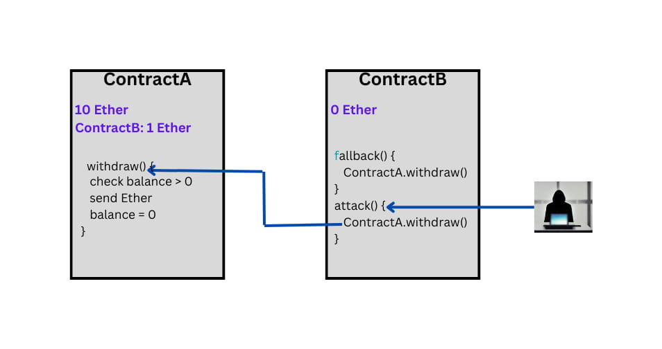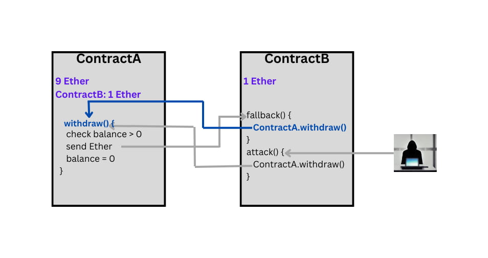A forma como a reentrada funciona (vamos seguir as setas passo a passo) é com o invasor chamando a função attack() que por dentro está chamando a função withdraw() do ContratoA. Dentro da função, ele irá verificar se o saldo do ContratoB é maior que 0 e se sim dará continuidade à execução.