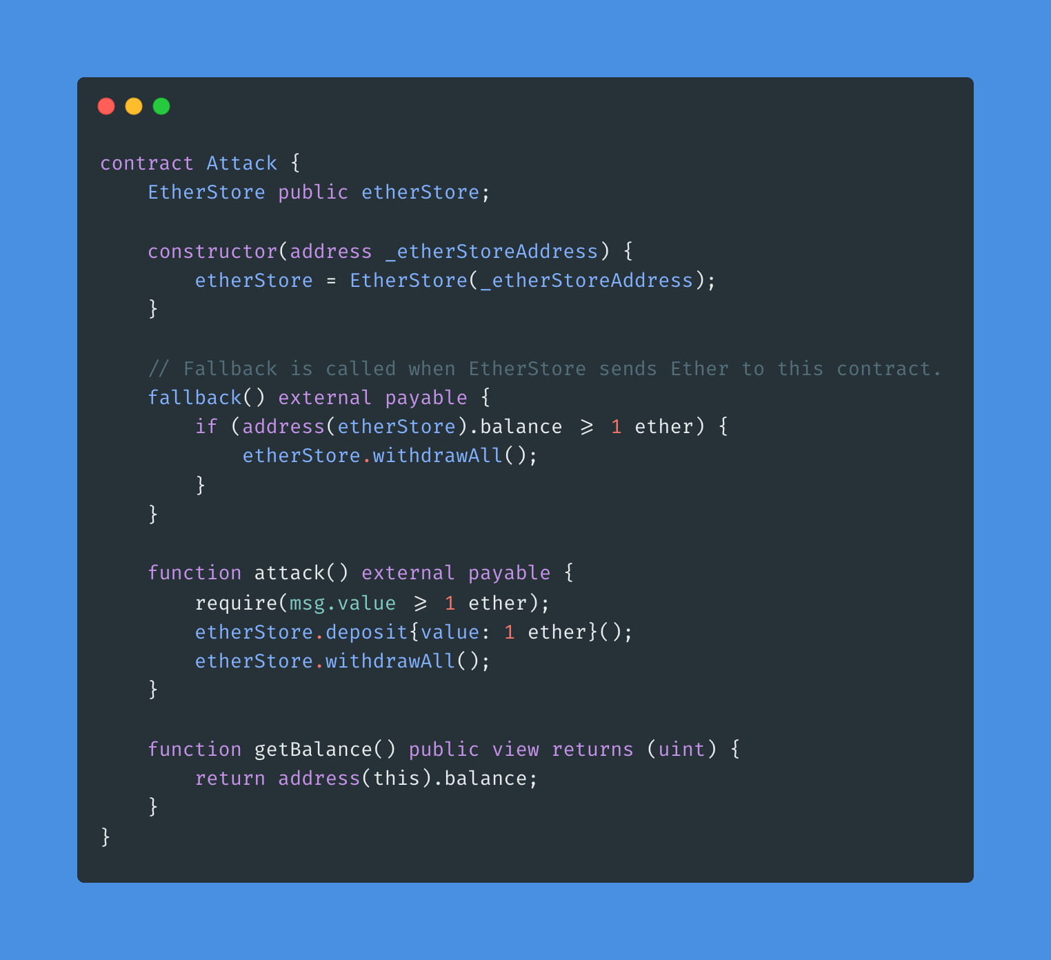E dentro da função attack() temos a lógica que explorará o EtherStore. Como podemos ver, primeiro iniciaremos o ataque certificando-nos de que temos éter suficiente, depois depositaremos 1 éter para ter um saldo maior que 0 no EtherStore e assim passaremos nas verificações antes de começar a sacar.