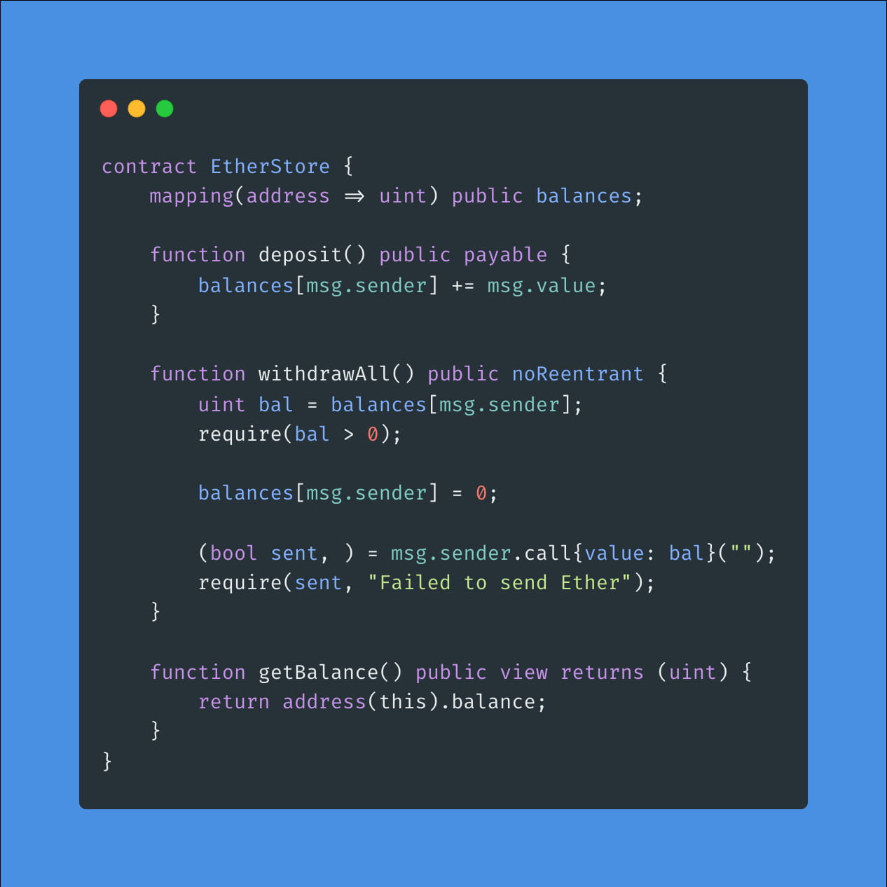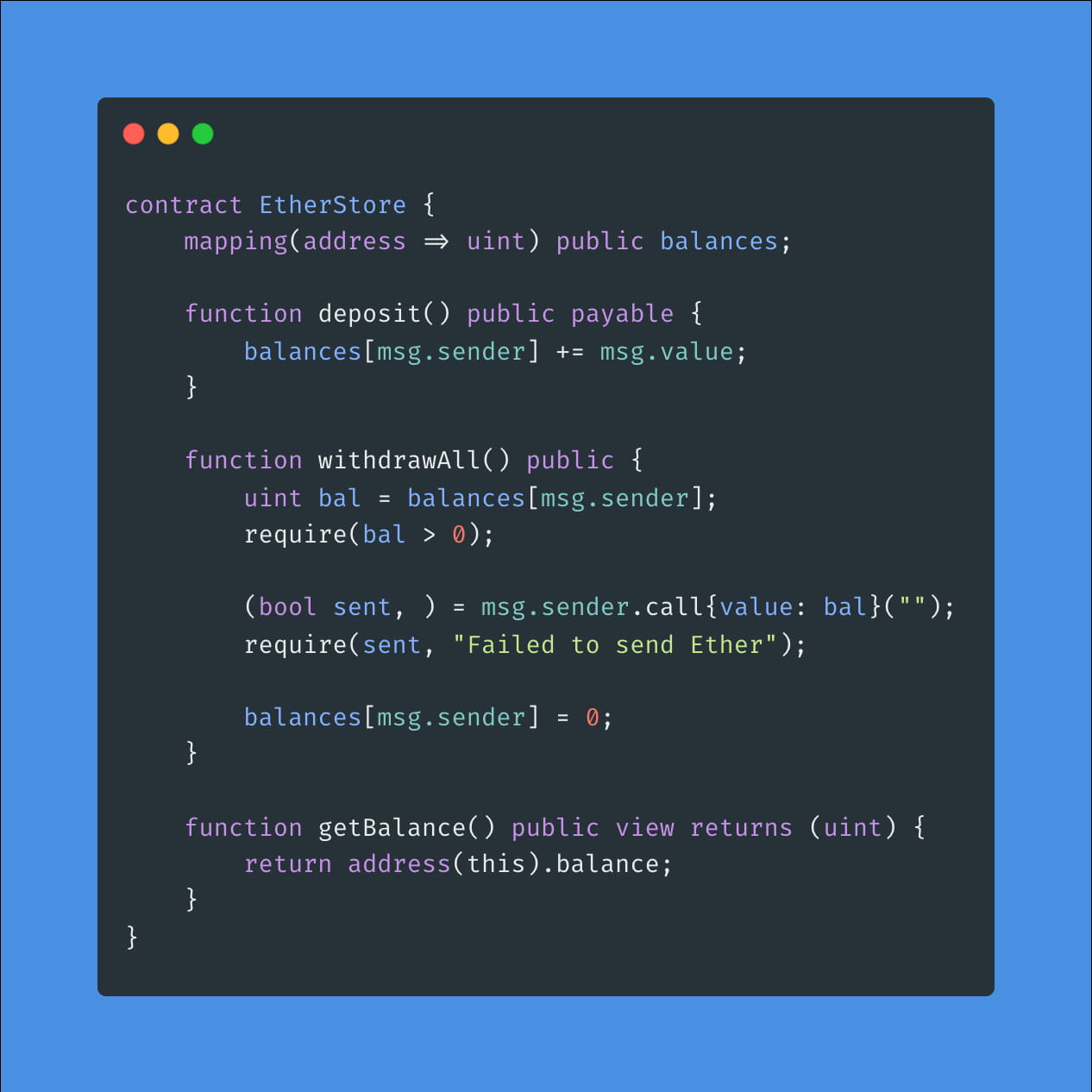 No contrato EtherStore, temos a função deposit() que armazena e atualiza os saldos do remetente e depois a função withdrawAll() que pegará todos os saldos armazenados de uma vez. Por favor, observe a implementação do withdrawAll() onde ele verifica primeiro com o require se o saldo é maior que 0 e logo após envia o Ether, novamente, deixando para o final a atualização do saldo do remetente para 0.