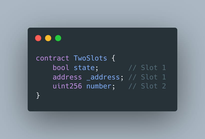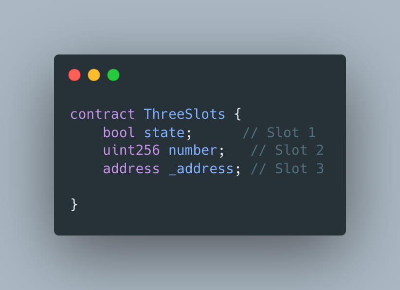 Aqui estamos usando os tipos de dados bool (1 byte), endereço (20 bytes) e uint256 (32 bytes). Então, conhecendo o tamanho dessas variáveis você pode entender facilmente que no primeiro exemplo do contrato TwoSlots como temos bool e endereço juntos (1 + 20 = 21 bytes, que é menor que 32 bytes) elas ocuparão um slot. No contrato ThreeSlots, como bool e uint256 não podem estar no mesmo slot (1 + 32 = 33 bytes, que é maior que a capacidade do slot), no total usaremos três slots.