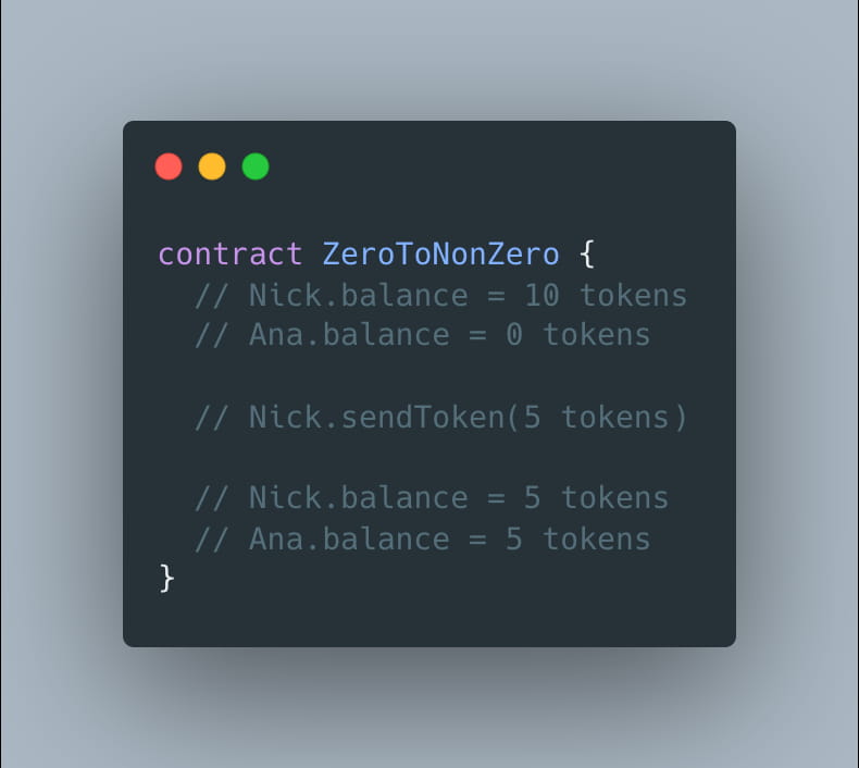 No primeiro exemplo de contrato ZeroToNonZero, diferente de zero a diferente de zero (5.000 gás*) + zero a diferente de zero (20.000 gás) = 25.000 gás