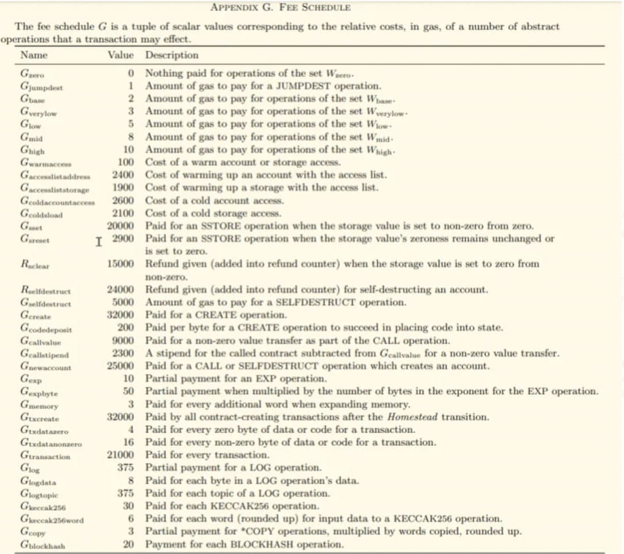 Já que vamos mergulhar no Ethereum, vou deixar aqui o trecho do seu Yellow Paper que especifica os custos do gás dos opcodes, e durante o artigo estaremos nos referindo a eles.