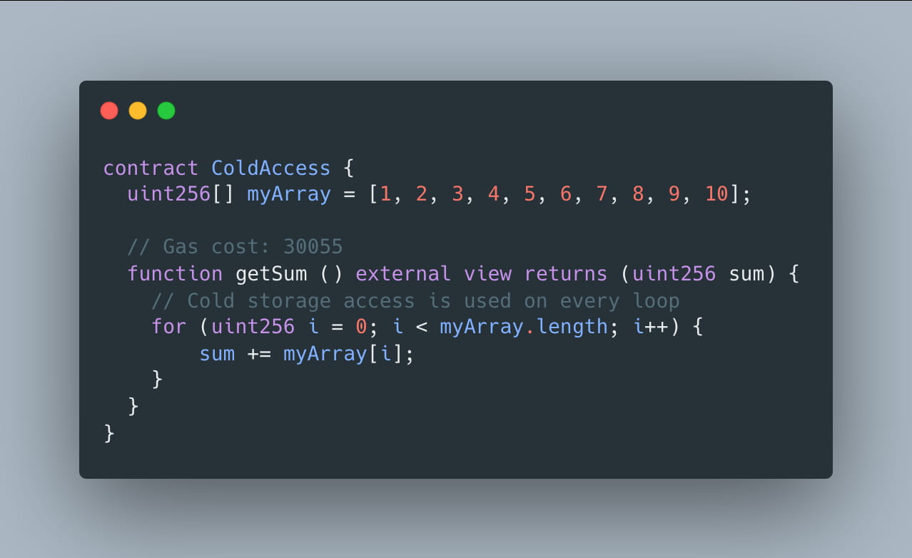 Armazenar os dados em cache dentro de uma função no Solidity pode resultar em menor uso de gás, mesmo que precise de mais linhas de código. Nesse caso, é trocando a localização do array e, em vez de usá-lo no armazenamento e, portanto, acessá-lo a frio todas as vezes no loop, ele armazena o array na memória, onde é mais barato acessá-lo.
