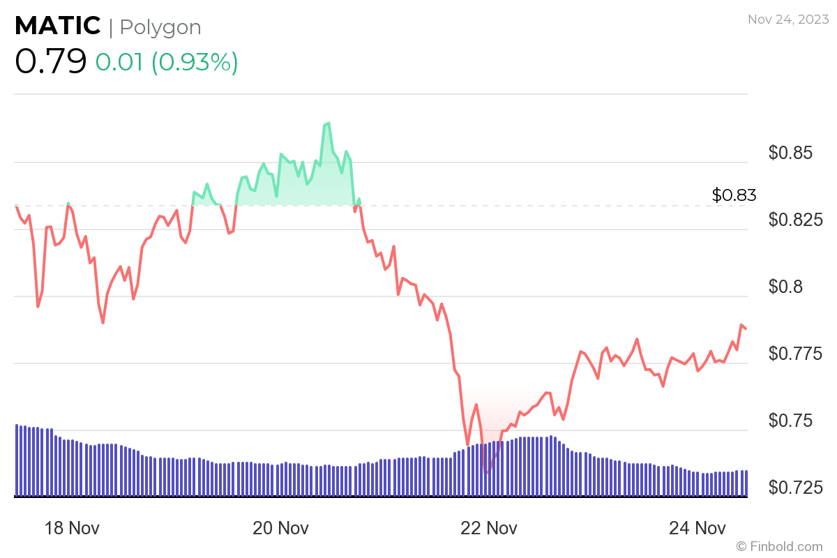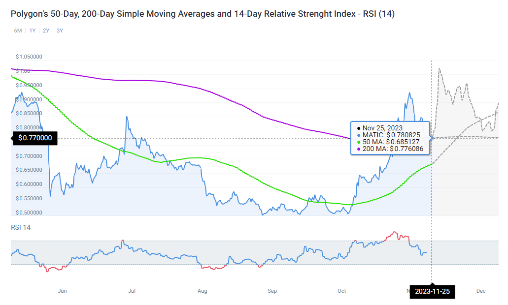 A média móvel simples (SMA) de 200 dias do Polygon é estimada em US$ 0,93, enquanto a SMA de curto prazo de 50 dias é estimada em US$ 0,86 no início de dezembro.
