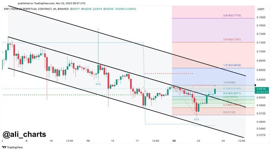 A criptomoeda parece estar saindo do padrão de baixa em que reside desde o início de novembro, sugerindo uma possível alta para US$ 0,65 em um futuro próximo, de acordo com a análise compartilhada pelo especialista em criptomoedas Ali Martinez em 23 de novembro.