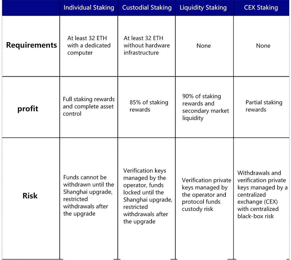Staking individual: requer pelo menos 32 ETH e um computador dedicado, bem como as condições e métodos de rede e energia para operar os nós. Os usuários podem obter todas as recompensas de aposta e controle total de ativos. Os fundos não podem ser sacados antes da atualização de Xangai, mas podem ser sacados com restrições após a atualização.