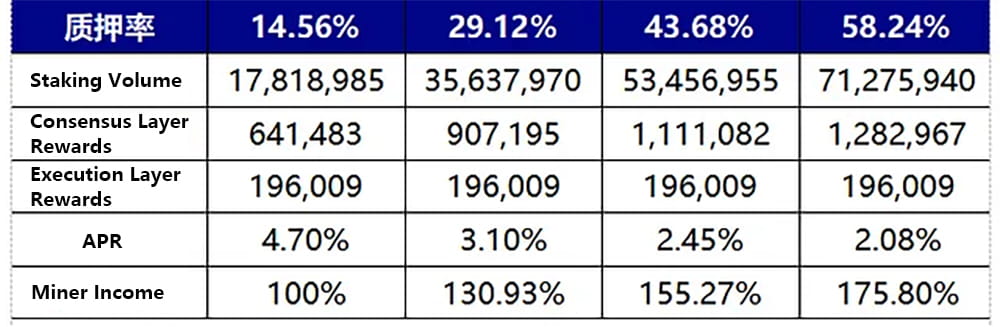 Com a atual taxa de staking de 14,56% correspondente às recompensas da camada de consenso e às recompensas da camada de execução como referência, a situação de rendimento do mineiro quando a taxa de staking atinge 2 a 4 vezes o nível atual é estimada com base nas duas condições acima. Ao mesmo tempo, assumindo que o padrão de taxa de protocolo LSD permanece inalterado, o múltiplo do crescimento da renda dos mineiros com o aumento da taxa de estaca é o múltiplo de crescimento da taxa de protocolo LSD da seguinte forma: