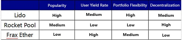 Do ponto de vista da concorrência no protocolo LSD, os fatores atuais que influenciam o desenvolvimento de cada protocolo LSD incluem popularidade, taxa de retorno, segurança de fundos, status de ancoragem, grau de descentralização e combinabilidade. Estas dimensões podem ser combinadas para analisar as semelhanças e diferenças entre os principais protocolos LSD no mercado.