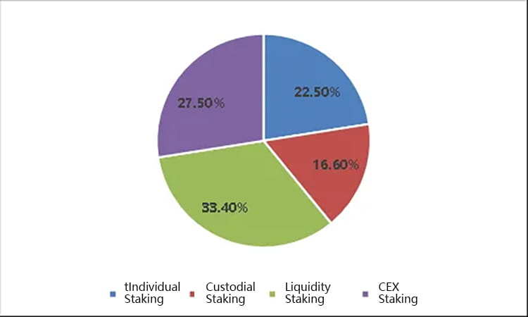As soluções de piquetagem Ethereum são divididas em quatro tipos, incluindo piquetagem individual, piquetagem de custódia, derivativos de piquetagem líquida (LSD) e piquetagem de câmbio centralizada. Tanto o LSD quanto o staking centralizado em exchanges ganharam a maior parte da participação de mercado devido às suas vantagens, como permitir a participação com pequeno capital, não exigir infraestrutura de hardware e a capacidade de liberar liquidez novamente por meio de certificados de staking. Do ponto de vista do número de nós, atualmente, o LSD detém uma participação de mercado de 33,4%, o CEX detém 27,5%, o staking de custódia (pool de staking) detém 16,6% e o staking individual detém 22,5%.