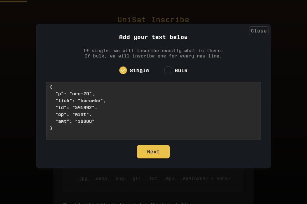 { "p": "orc-20", "tick": "harambe", "id": "541992", "op": "mint", "amt": "100000" }