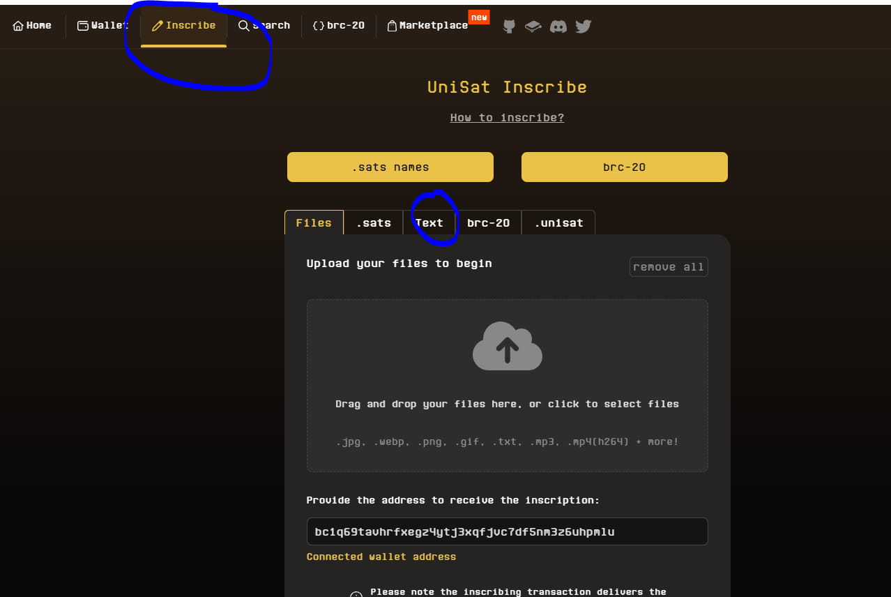 Acesse o Unisat acessando o seguinte link: https://unisat.io/inscribe e clique em “Conectar” para conectar sua carteira Unisat à interface. Escolha "Inscrever" e "Texto" para selecionar o tipo de token que deseja cunhar.