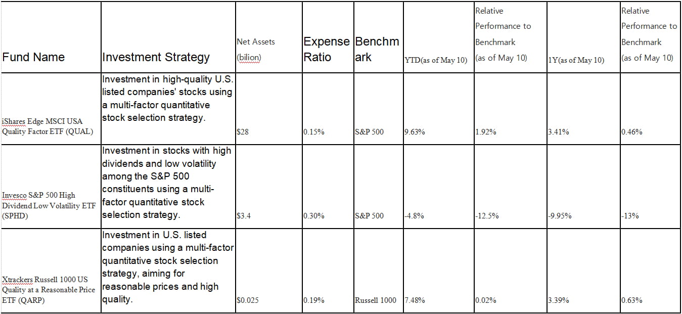 A rigor, SPHD e QUAL são considerados fundos de gestão passiva com algumas estratégias de valorização. Estas estratégias de valorização visam otimizar fatores específicos da carteira, mas a estratégia global de investimento dos fundos continua focada no acompanhamento de índices específicos. Por outro lado, o QARP não só utiliza a gestão passiva para acompanhar um índice, mas também emprega algumas estratégias de melhoria e gestão ativa para selecionar os constituintes da sua carteira, tornando-o um fundo gerido ativamente mais típico.