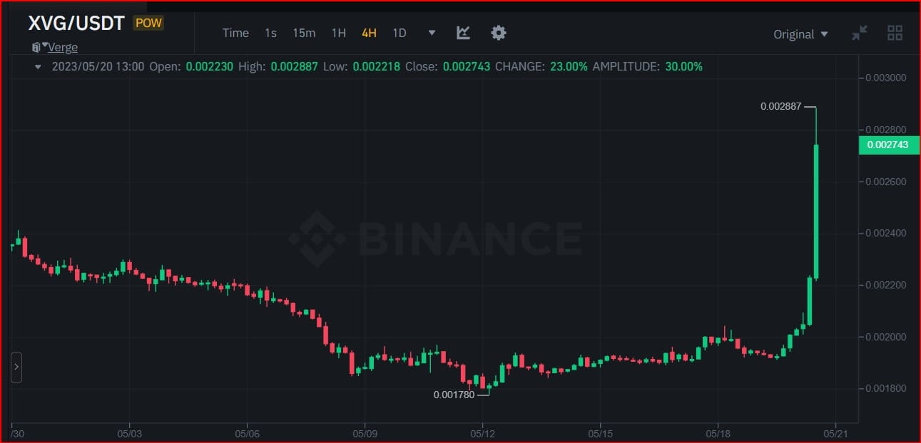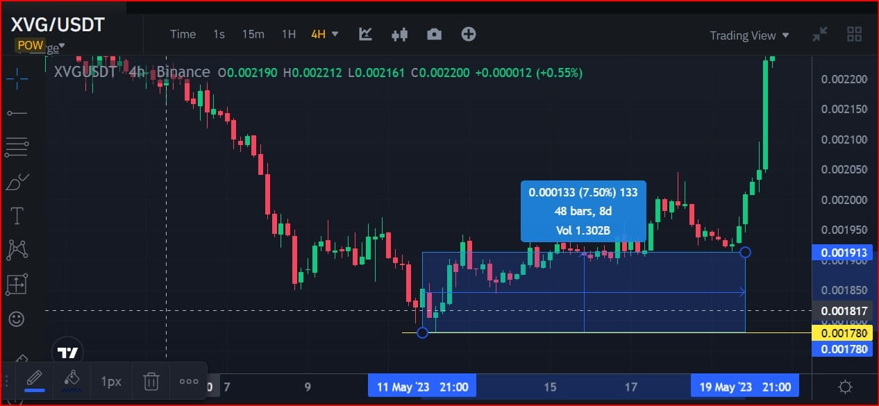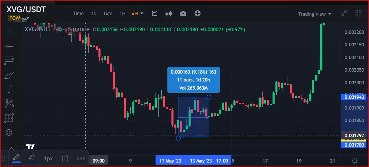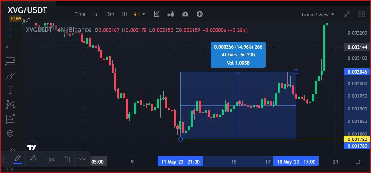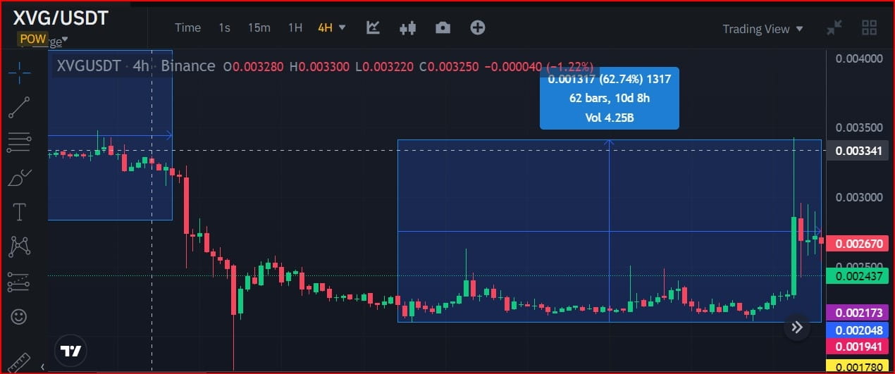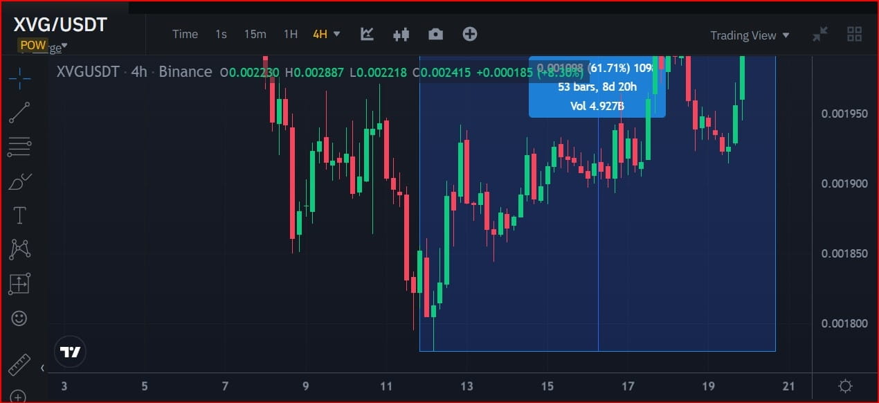 Como você pode ver nos dados do gráfico de preços de velas, a seção de tendência de alta mais atual do par de CRIPTOMOEDA XVG/USDT subiu aproximadamente 62,29% ao longo de 9 dias.