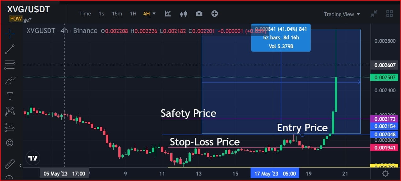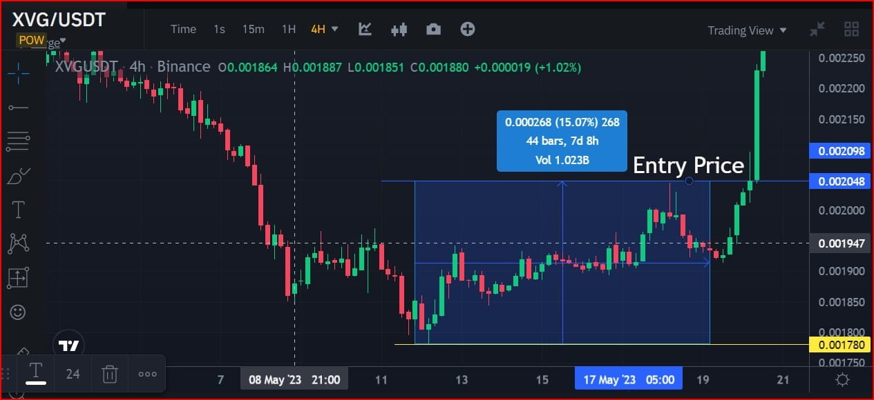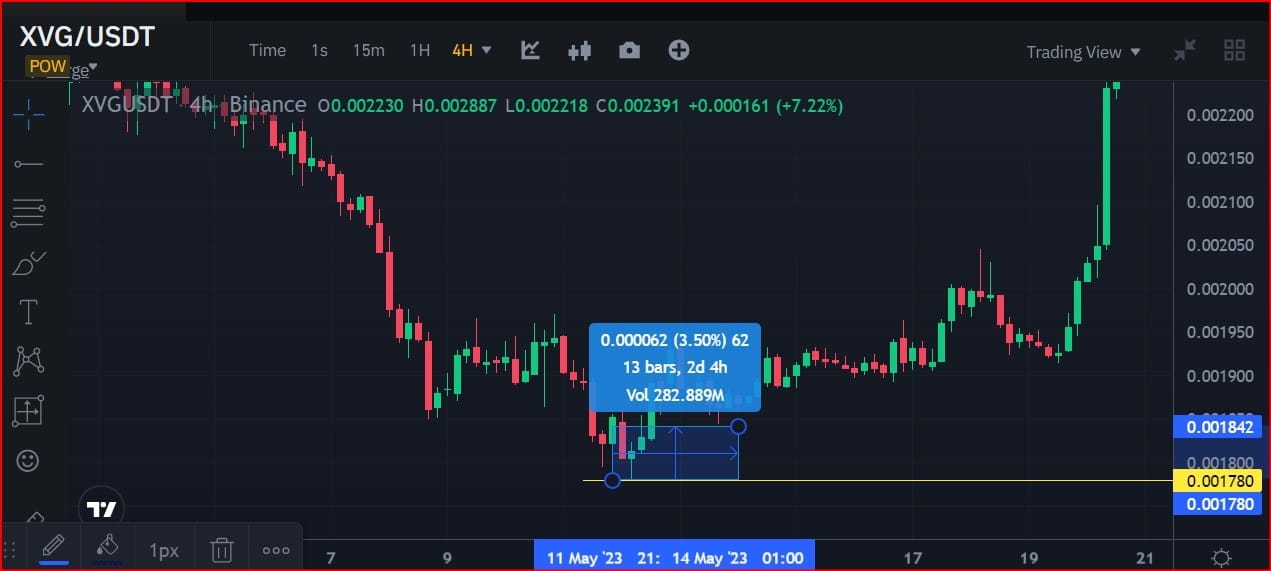 E a partir do menor preço deste candle verde de início de tendência de alta, as ações de preço do par de CRIPTOMOEDA XVG/USDT saltaram 9,18% e depois caíram novamente para 3,5%, saltaram novamente 14,96 e depois caíram novamente 7,50% e finalmente saltaram novamente 62,29% para completar seu ciclo padrão de uma operação de tendência de alta no maior preço da tendência de alta, que é US$ 0,002889.