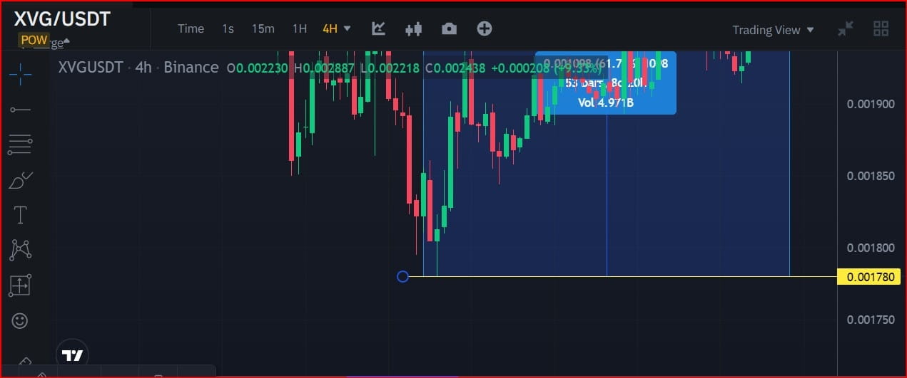 Então, vamos direto ao ponto para identificar a seção de tendência de alta mais atual do par de CRIPTOMOEDA XVG/USDT.