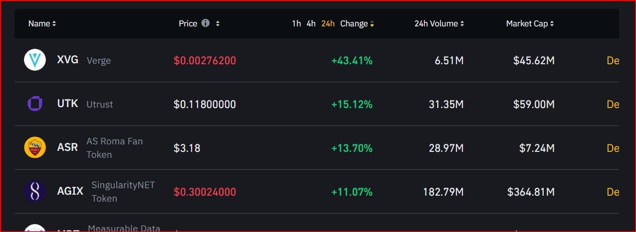 Por exemplo; No momento, o par de CRIPTOMOEDA com melhor desempenho na BINANCE Exchange é o par de CRIPTOMOEDA XVG/USDT.