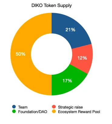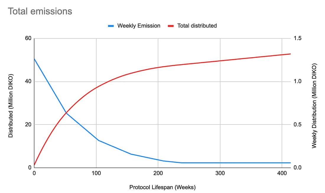 O lançamento semanal inicial é de aproximadamente 1,3 milhões de DIKO, seguido por uma redução de 2% a cada duas semanas. Atualmente, o fornecimento circulante é de 35.902.590 tokens, respondendo por 35,9% do fornecimento total de tokens.