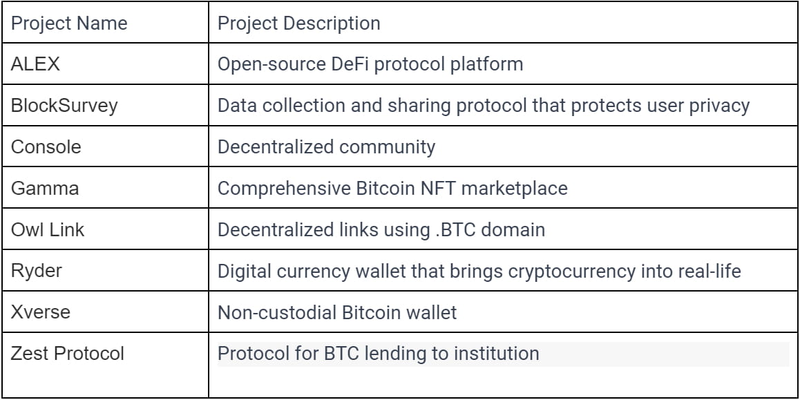 O Stacks foi inicialmente lançado como um projeto de código aberto por construtores de Bitcoin, e os desenvolvedores por trás dele têm uma rica experiência na construção de aplicativos e protocolos sobre a rede Bitcoin. Atualmente, há mais de 30 entidades e desenvolvedores independentes contribuindo para o ecossistema Stacks, tornando-o um dos ecossistemas mais prósperos entre os projetos BTC Layer 2. Em março de 2023, o site oficial listava um total de 88 projetos, com foco em 8 projetos principais.