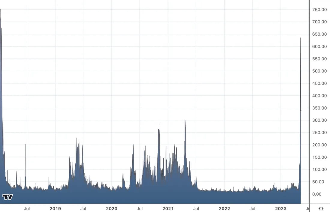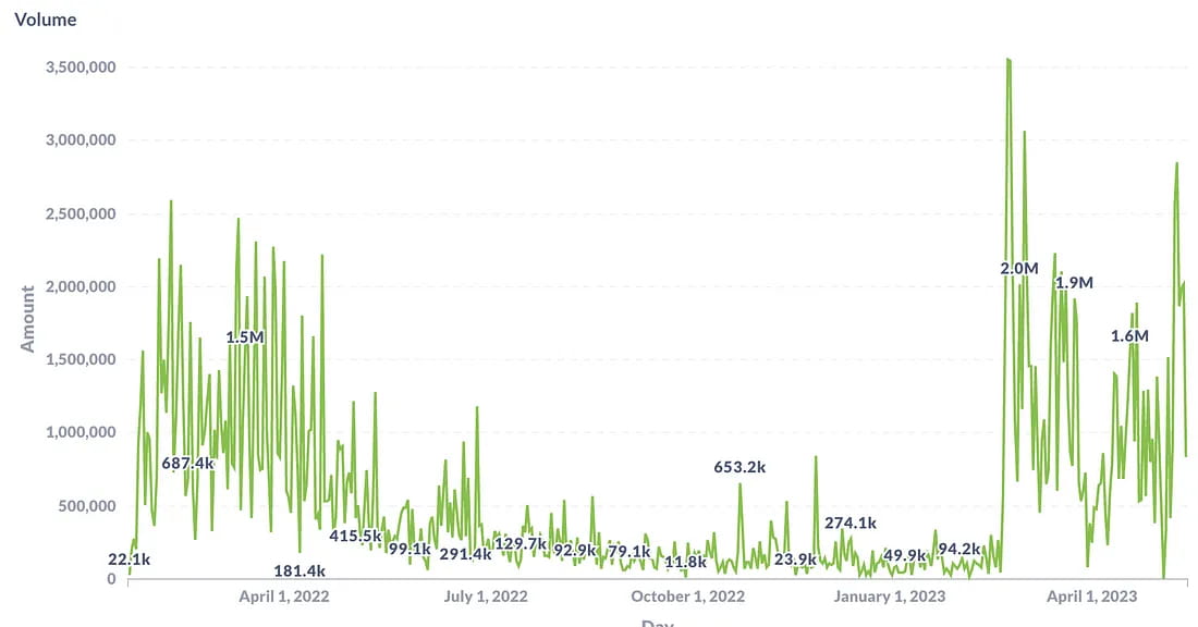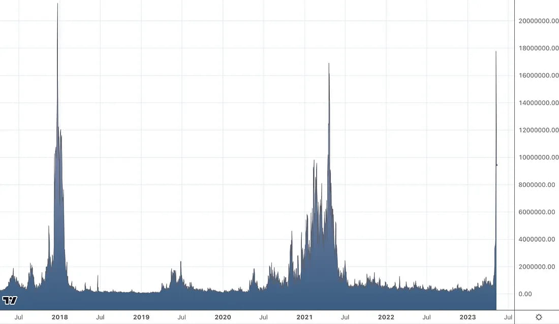 A popularidade do BTC NFT e do BRC20 também levou a um aumento nas taxas de transação na cadeia do Bitcoin, e os ganhos dos mineradores cresceram correspondentemente. O pico das taxas de transação de um único dia em USD já se nivelou com os mercados em alta no final de 2017 e abril de 2021. Ordinals trouxe uma nova tendência, mas o BRC20 e o BTC NFT não são baseados em casos de uso reais. Se o volume de negociação do BTC NFT e do BRC20 desaparecerá da vista do público depois que o calor diminuir, ainda precisa de tempo para verificar.