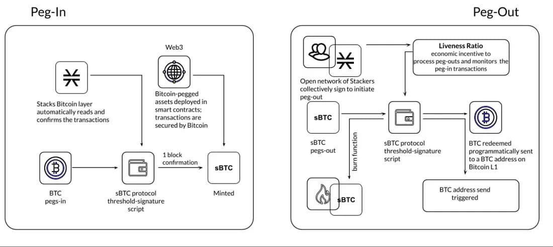 Quando um usuário deseja converter BTC para SBTC, ele precisa enviar BTC para um endereço multiassinatura e iniciar uma transação na rede Stacks. Esta transação aciona um contrato inteligente que envia BTC para o endereço multiassinatura e cria uma quantidade correspondente de ativos SBTC na rede Stacks. Quando um usuário deseja converter SBTC de volta para BTC, ele precisa enviar uma mensagem para o contrato inteligente e iniciar outra transação na rede Stacks. Esta transação aciona outro contrato inteligente que queima a quantidade correspondente de ativos SBTC e envia ao usuário a quantidade correspondente de BTC.