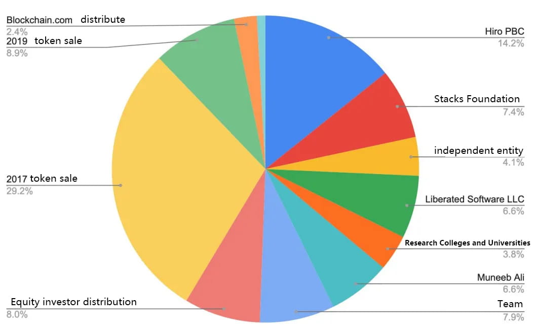 A distribuição das recompensas de mineração é a seguinte: 1.000 STX por bloco nos primeiros 4 anos, 500 STX por bloco nos próximos 4 anos, 250 STX por bloco nos 4 anos subsequentes e, então, uma distribuição permanente de 125 STX por bloco. Os STX alocados para fundadores e funcionários seguem um cronograma de desbloqueio de 3 anos.
