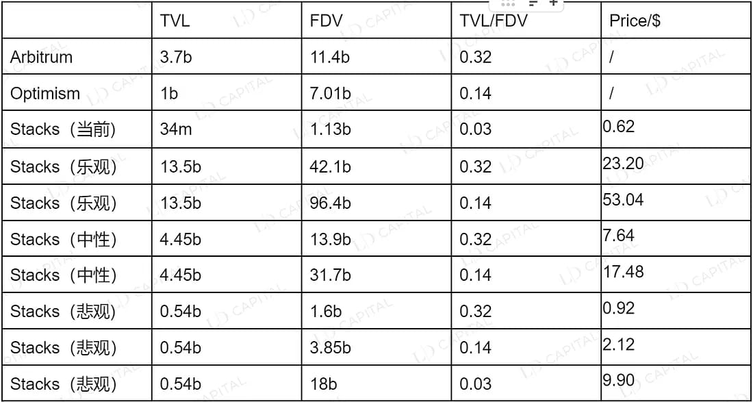 Usando os valores TVL/FDV dos atuais projetos Ethereum Layer 2, Arbitrum e Optimism, como valores de referência, uma estimativa pode ser feita para Stacks.