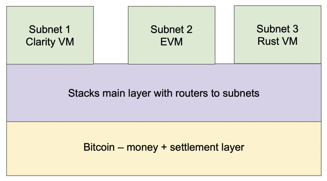 A arquitetura técnica do Stacks inclui uma camada central e sub-redes, com desenvolvedores e usuários podendo escolher entre as duas. A mainnet do Stacks é altamente descentralizada, mas tem um baixo rendimento, enquanto as sub-redes são menos descentralizadas, mas têm um rendimento maior. Dado que os mineradores/operadores de uma sub-rede podem exigir alta largura de banda de rede entre os pools de mineração, como usar nós de data center, eles podem até mesmo colocar os pools de mineração de sub-rede na lista de permissões para garantir alto desempenho.