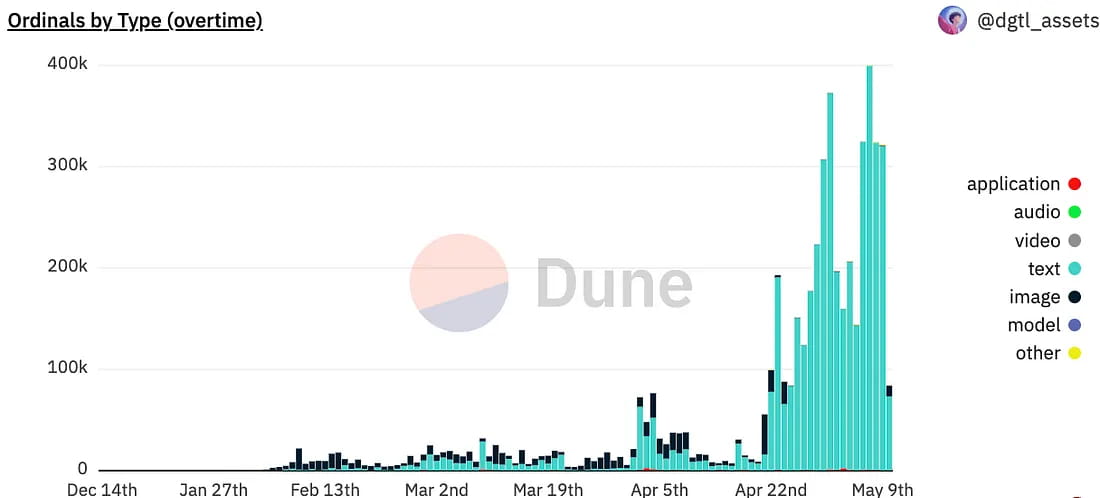 Posteriormente, o usuário @domodata acreditou que quando as informações anexadas no protocolo Ordinals são definidas para um padrão unificado, o protocolo Ordinals não só pode emitir tokens não fungíveis (NFTs), mas também tokens fungíveis (FTs). Portanto, em 8 de março, @domodata criou o primeiro token padrão experimental BRC20 ORDI por meio do protocolo Ordinals. Em 10 de maio, o preço histórico mais alto do ORDI ultrapassou US$ 29, e havia mais de 14.000 tipos de tokens BRC20. O número cumulativo de inscrições forjadas por Ordinals atingiu até 5,7 milhões de vezes, com um pico de 400.000 vezes em um único dia em 7 de maio. Além disso, os principais tipos de Ordinals são imagens e texto. O surto de tokens do tipo texto (BRC20) em 23 de abril aumentou significativamente a taxa de uso da rede Bitcoin.