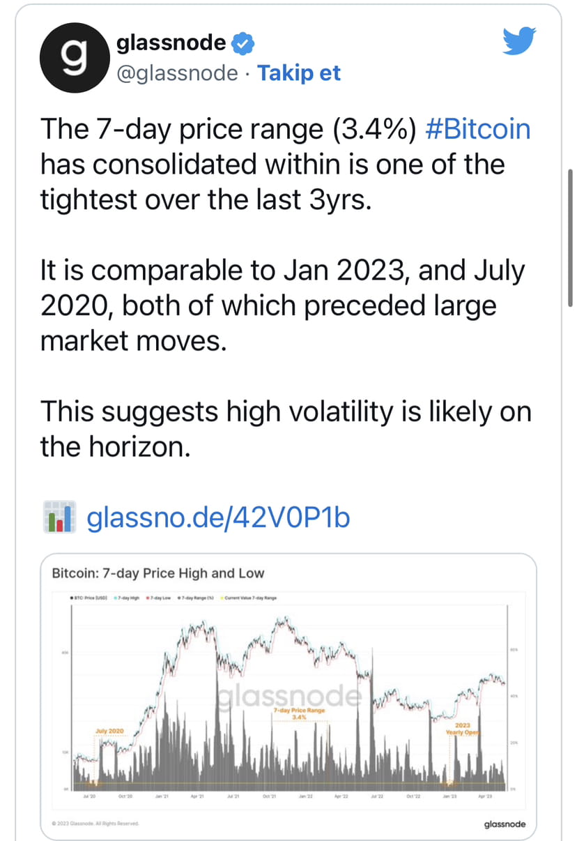 De acordo com a análise, é possível fazer uma comparação entre as consolidações observadas em julho de 2020 e janeiro de 2023, pois ambos os exemplos foram acompanhados de significativas oscilações de mercado. A empresa informou que, no geral, a situação atual do Bitcoin indica que a alta volatilidade é iminente.