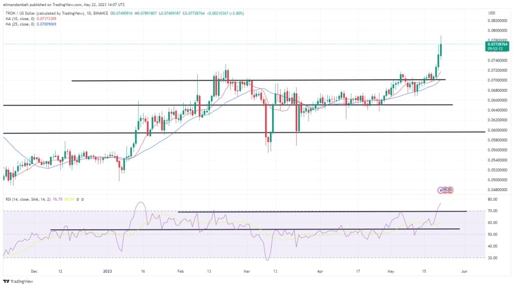 Como resultado da mudança de segunda-feira, o TRON atingiu seu ponto mais forte desde 10 de junho do ano passado.