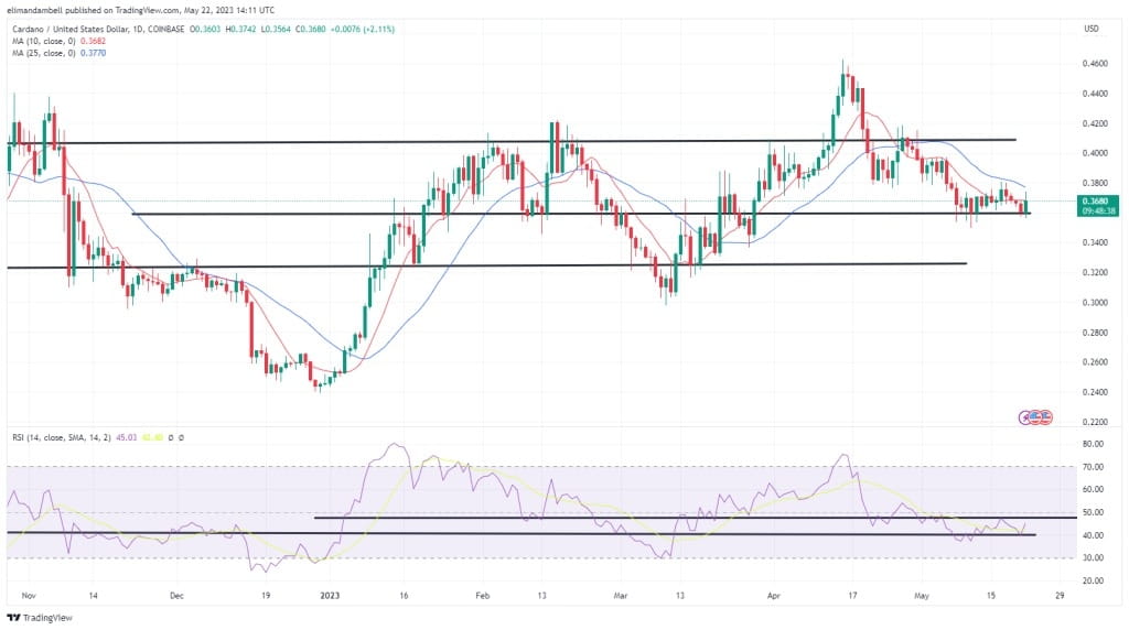 Após uma baixa de US$ 0,3573 no domingo, o par ADA/USD subiu até 2% hoje, atingindo uma alta de US$ 0,3732.