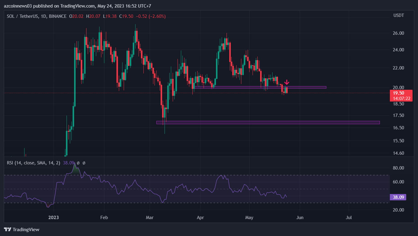O gráfico diário também mostra um cenário de baixa similar ao do período semanal. Ele indica que o preço do SOL caiu abaixo da zona de suporte menor em $20 e está em processo de confirmação desse nível como resistência (destacado pela seta vermelha).