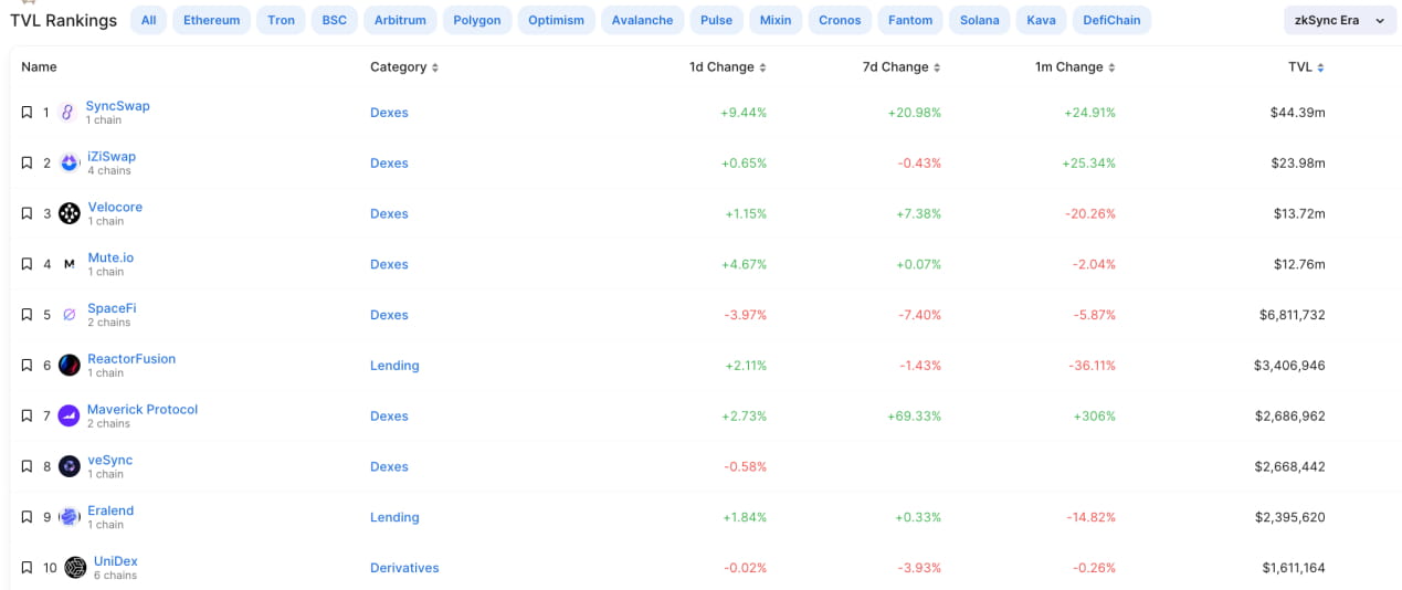De acordo com as estatísticas da Defillama, os cinco principais projetos atuais em termos de TVL no ecossistema zkSync Era são todos exchanges descentralizadas (DEXs).