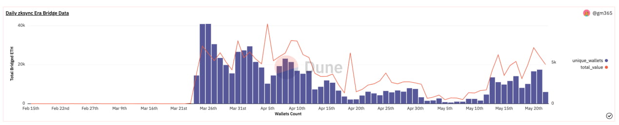 De acordo com dados do navegador, o zkSync Era processou aproximadamente 21 milhões de transações on-chain desde seu lançamento, com 1,7 milhão de endereços exclusivos. Devido ao impacto do airdrop do Arbitrum, o zkSync ganhou atividade on-chain significativa logo após seu lançamento. Inicialmente, o número de endereços ativos diários flutuou na faixa de 60–80 mil, mas caiu para cerca de 30 mil no início de maio. No entanto, ele experimentou um aumento acentuado impulsionado por várias atividades e airdrops.