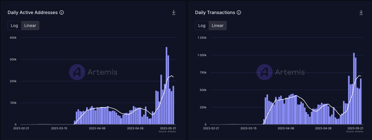 Os dados oficiais da ponte também refletem um nível similar de atividade. Devido ao estímulo do airdrop do Arbitrum, houve um aumento significativo em endereços ativos durante as três primeiras semanas após o lançamento da mainnet. De meados ao final de abril até o início de maio, houve um número relativamente menor de endereços ativos. No entanto, de meados de maio em diante, os dados começaram a mostrar crescimento novamente, indicando um aumento na atividade.