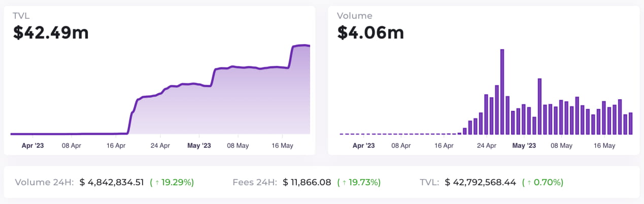 Os dados do protocolo sobre defillama podem diferir significativamente de seu site oficial. O gráfico a seguir descreve o TVL e o volume de negociação conforme exibido no site oficial.