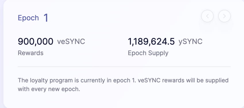 Os usuários conseguiram ganhar 1 ySYNC para cada $1 em taxas de negociação geradas. Durante a época de gênese, os usuários cunharam um total de 1,18 milhão de tokens ySYNC (equivalente a gerar $1,18 milhão em taxas de negociação). Os 900.000 tokens SYNC foram então distribuídos com base na média de holding de tokens ySYNC, resultando em aproximadamente 0,76 tokens SYNC para cada ySYNC. Atualmente, a atividade está pausada após a época de gênese.