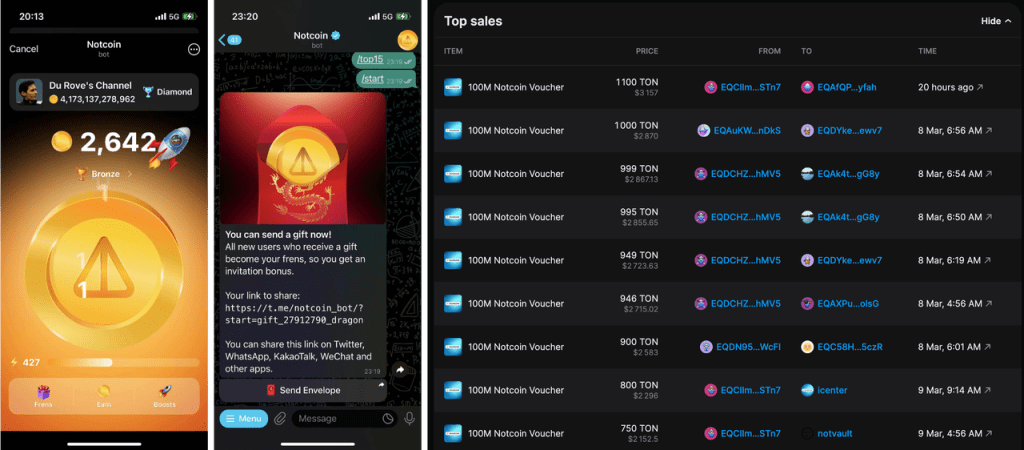 No projeto Meme Notcoin, os jogadores se envolvem na atividade de tocar em moedas para ganhar pontos. Além disso, eles podem se juntar a equipes lideradas por celebridades, como o fundador do Telegram, Durov, ou ganhar atração enviando "pacotes vermelhos" para amigos. Por meio de sua jogabilidade sem frescuras e estratégia de marketing viral, o Notcoin atraiu rapidamente 5 milhões de jogadores em apenas uma semana, com a base de jogadores atual excedendo 26 milhões e 1 milhão de seguidores no X. Na negociação pré-mercado lançada recentemente, o maior negócio foi a compra de um bilhão de pontos com 1100 $TON, o que equivalia a aproximadamente $4521.