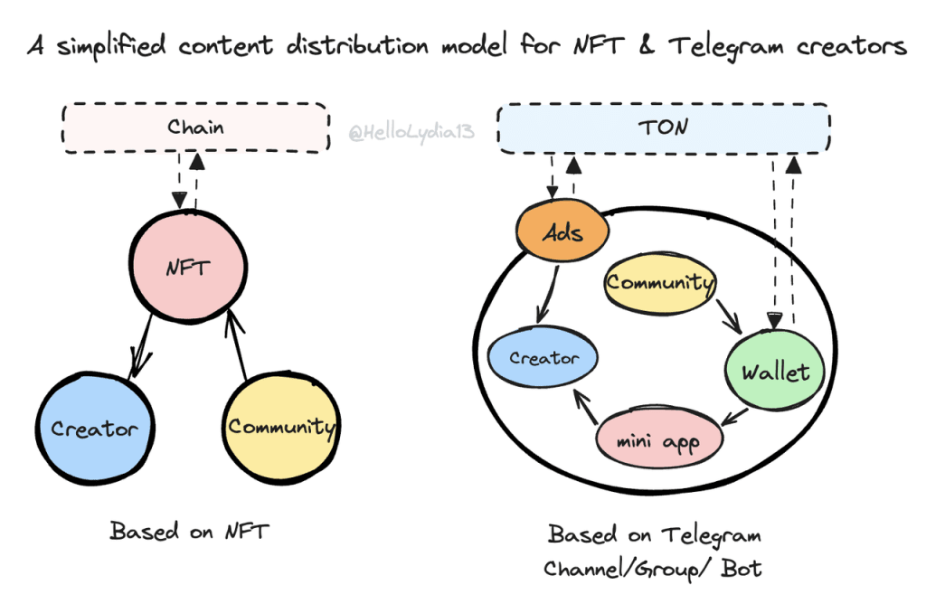 Comparado a muitos projetos NFT e SocialFi que ainda lutam para encontrar cenários de aplicação para seus ativos, o ecossistema TON, desenvolvido na plataforma Telegram, oferece uma experiência de produto mais amigável e rede de valor para desenvolvedores, criadores e usuários Web2 — em redes sociais existentes, desconstruindo ainda mais o modelo de distribuição Web3 em uma combinação de práticas comerciais tradicionais Web2, carteiras de middleware e acordos financeiros Web3. Essa abordagem não apenas simplifica o processo de integração para criadores e usuários, mas também diversifica os fluxos de receita dos criadores por meio de mecanismos como compartilhamento de receita de anúncios.