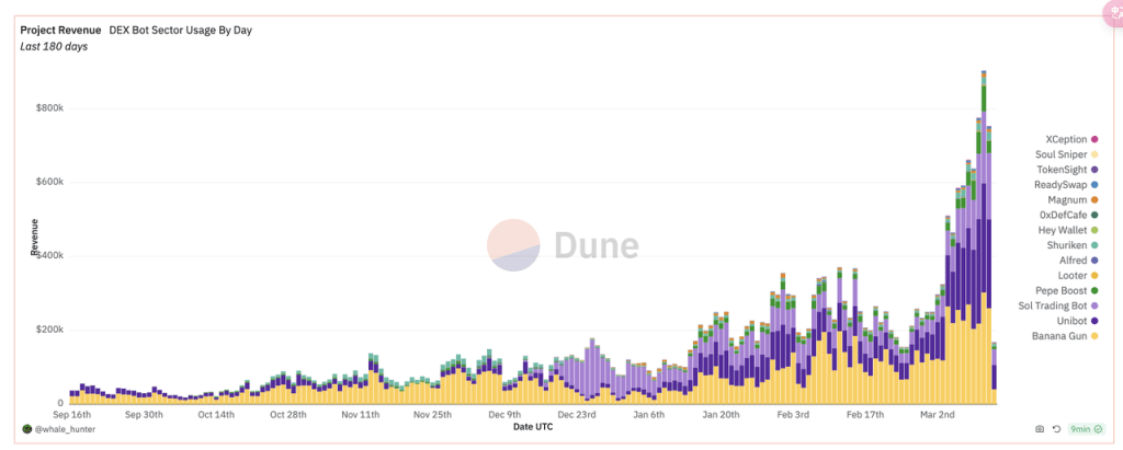 O setor de Trading Bot tem visto um crescimento explosivo desde 2023, emergindo como um dos poucos produtos com demanda genuína e fluxo de caixa durante o mercado de baixa. À medida que o mercado muda de baixa para alta, o fascínio financeiro desses Bots se intensificou, com protocolos líderes como Banana Gun e Unibot gerando receitas diárias superiores a US$ 200.000. Embora uma minoria esteja hospedada em sites e Discord, a maioria dos Trading Bots é integrada por meio do Telegram.