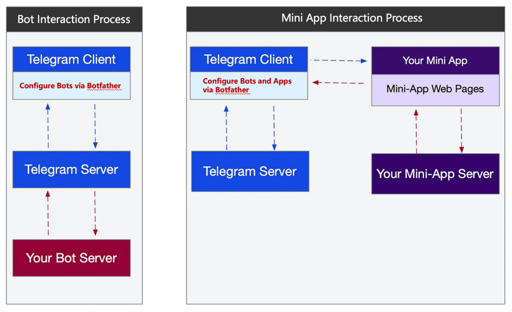 Após o lançamento dos Mini Apps, os Bots não foram relegados à obsolescência; em vez disso, eles desempenham um papel de “sala de retransmissão”. Eles servem como o gateway principal para interações do usuário, conectando perfeitamente uma série de Mini Apps.