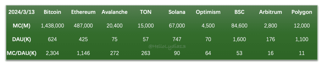 Os números no DefiLlama e no CoinMarketCap parecem mostrar conclusivamente que a TON é uma "gigante pouco conhecida entre as cadeias" — consistentemente classificada entre as 20 primeiras em termos de capitalização de mercado, mas seu volume de negociação de 24 horas permanece além das 100 primeiras. Apesar de atingir um novo pico em Valor Total Bloqueado (TVL) em US$ 53 milhões, ela não conseguiu entrar nas 50 principais cadeias públicas; além disso, sua capitalização de mercado para a proporção de TVL atingiu um surpreendente 293, que é 33 vezes maior que a do Ethereum.