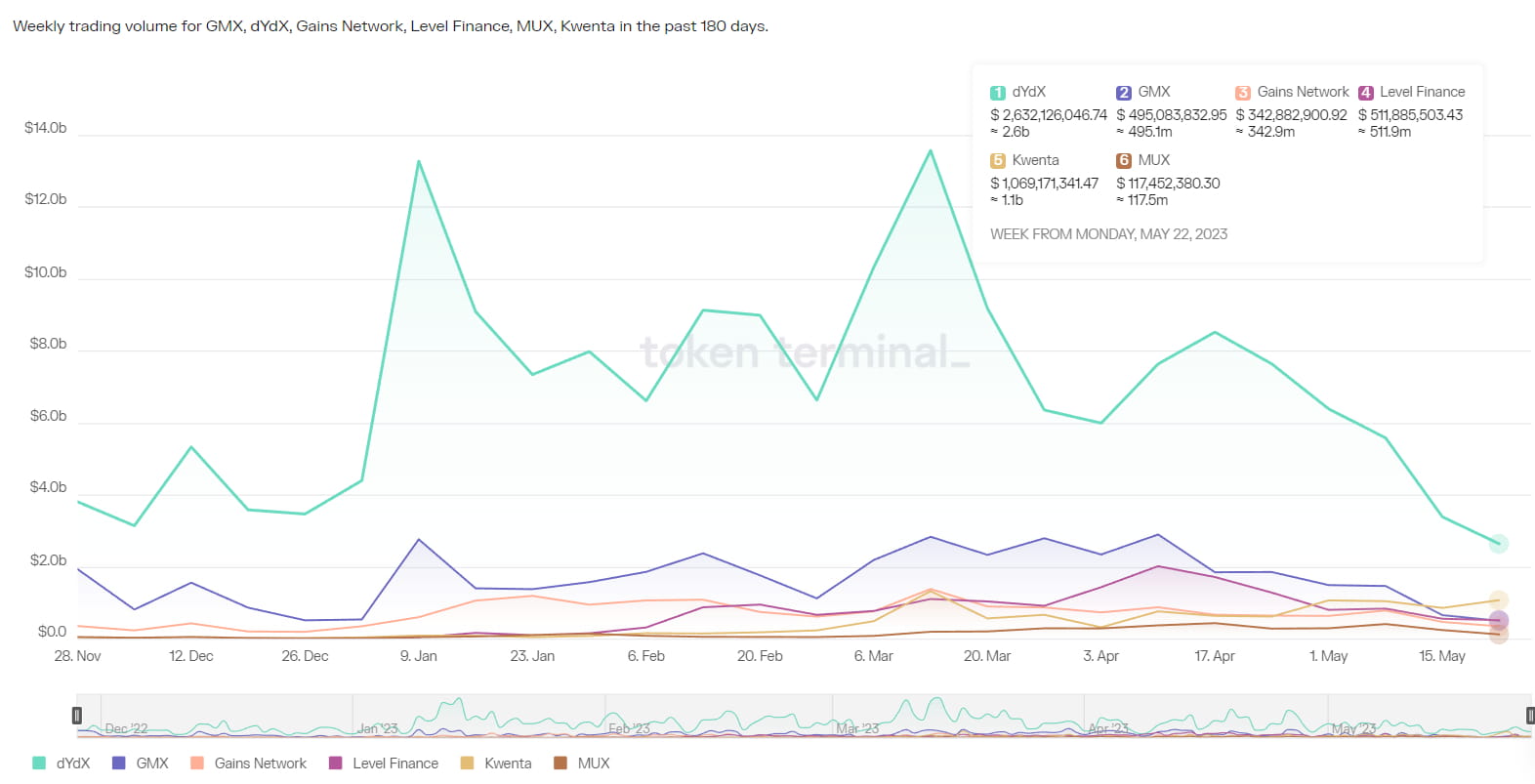 No modelo de carteira de pedidos, o DYDX continua a dominar quase metade do volume de negociação do mercado. Entre os DEXes derivativos do modelo de pool de fundos, a participação de mercado da Kwenta em termos de volume de negócios ultrapassou o GMX por vários dias consecutivos na semana passada. A GMX atingiu um pico recente no volume de negociação semanal em meados de abril, enquanto o volume de negociação semanal da Kwenta mostrou um aumento geral em maio em comparação com abril.
