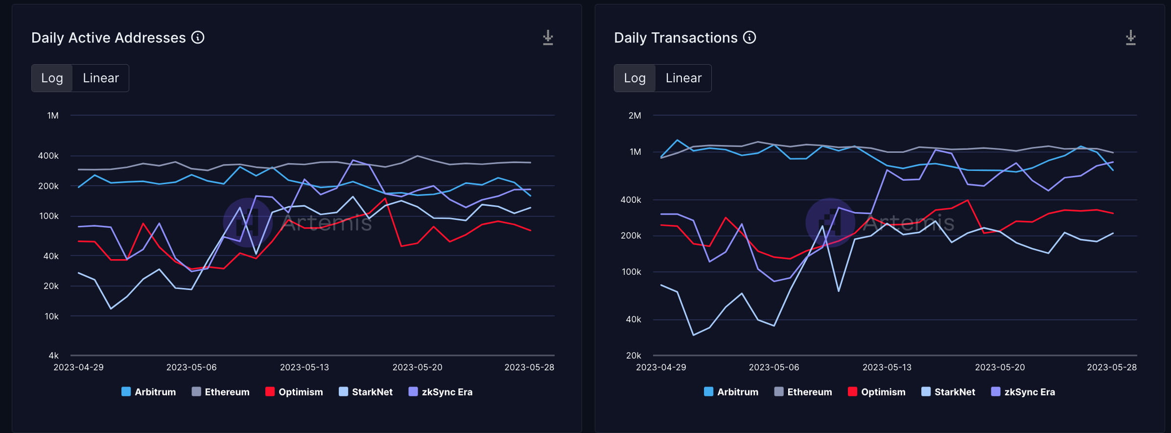 Nos últimos tempos, a atividade geral na rede tem sido a seguinte: Arbitrum > era zksync > Otimismo > Starknet. É importante notar que a era zksync ultrapassou o Arbitrum várias vezes em termos de atividade na rede.