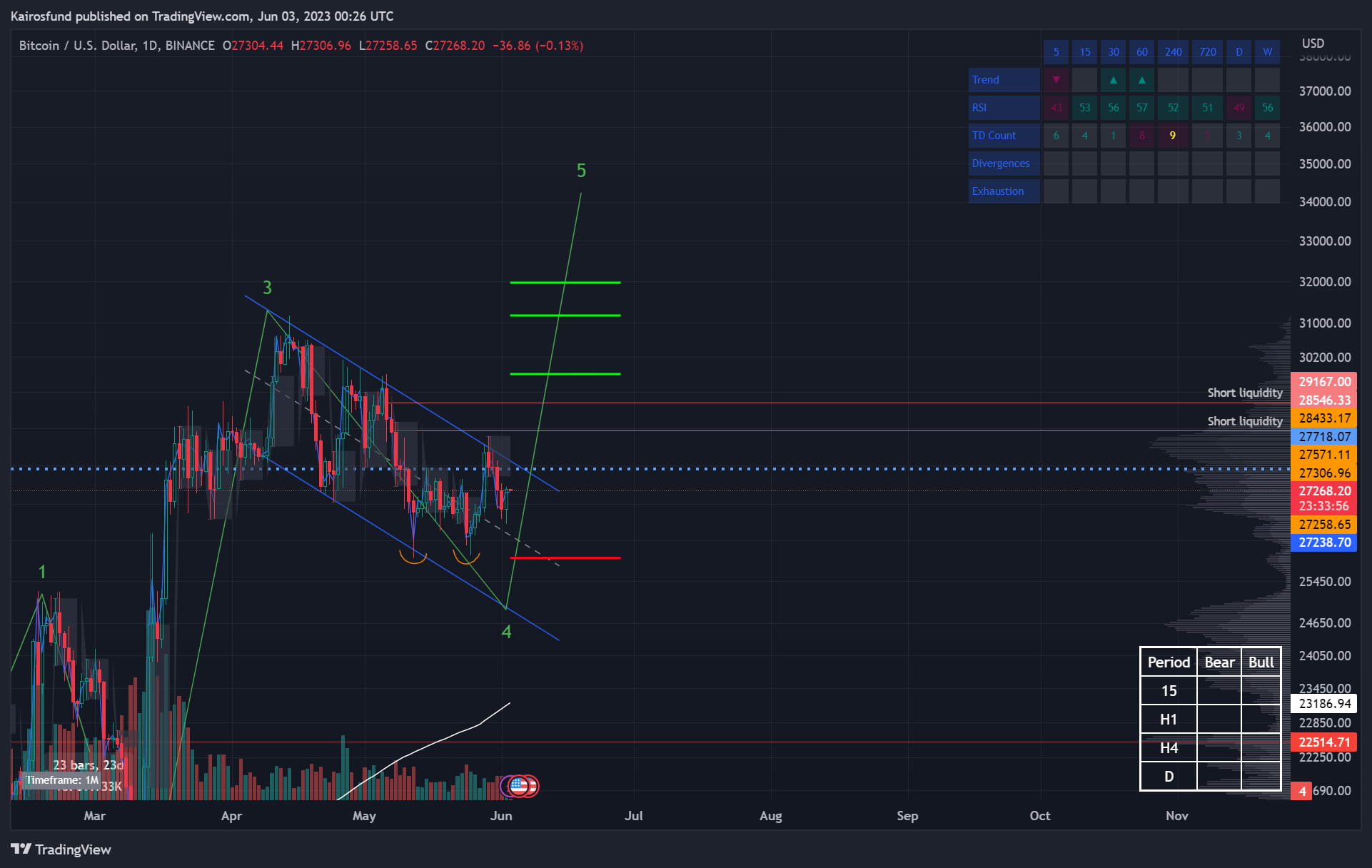 Afastando o zoom, minha perspectiva global se inclina para o otimismo, esperando uma subida triunfante. Parece que estamos no meio de uma onda 4 complexa, que deve nos impulsionar além da marca de 32 mil — uma jornada ao centro do universo cripto!