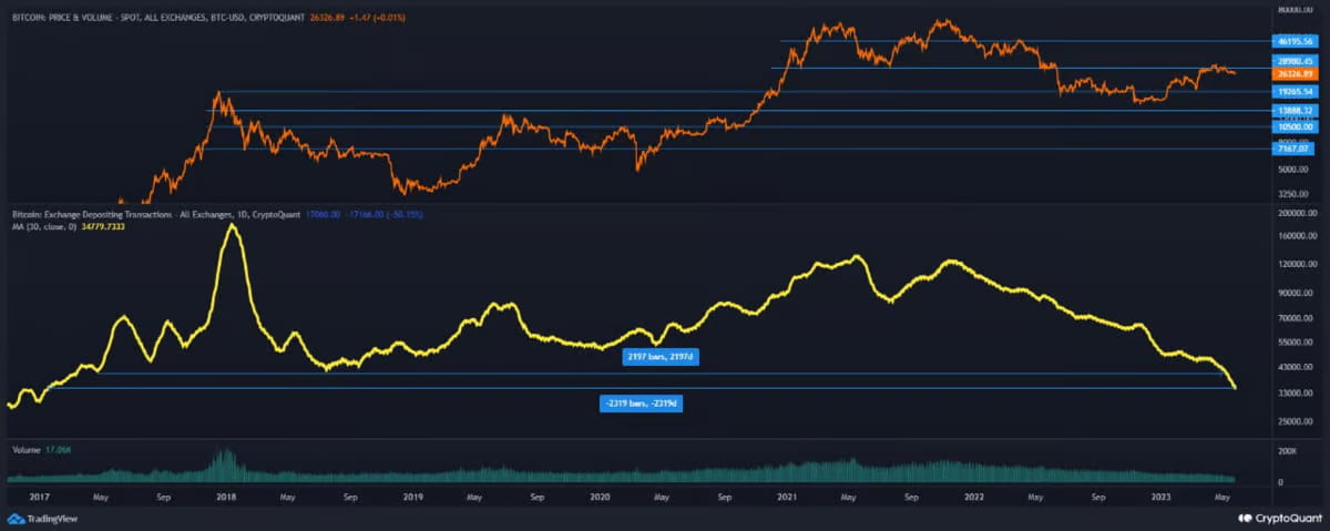 Mas vamos falar também sobre o comportamento fascinante dos detentores de Bitcoin. As corretoras centrais estão passando por uma seca de Bitcoin – o menor volume de depósitos de BTC desde os dias de glória de janeiro de 2017! Será que isso é a determinação férrea dos detentores inveterados ou apenas um efeito colateral do show de merda da FTX?