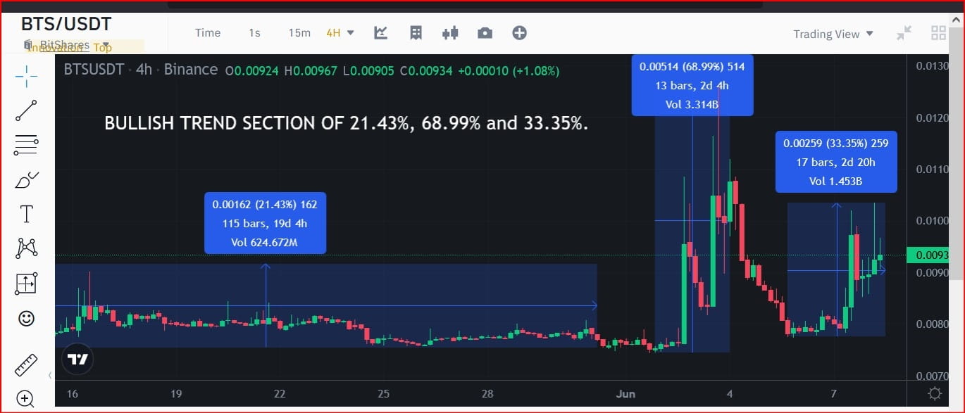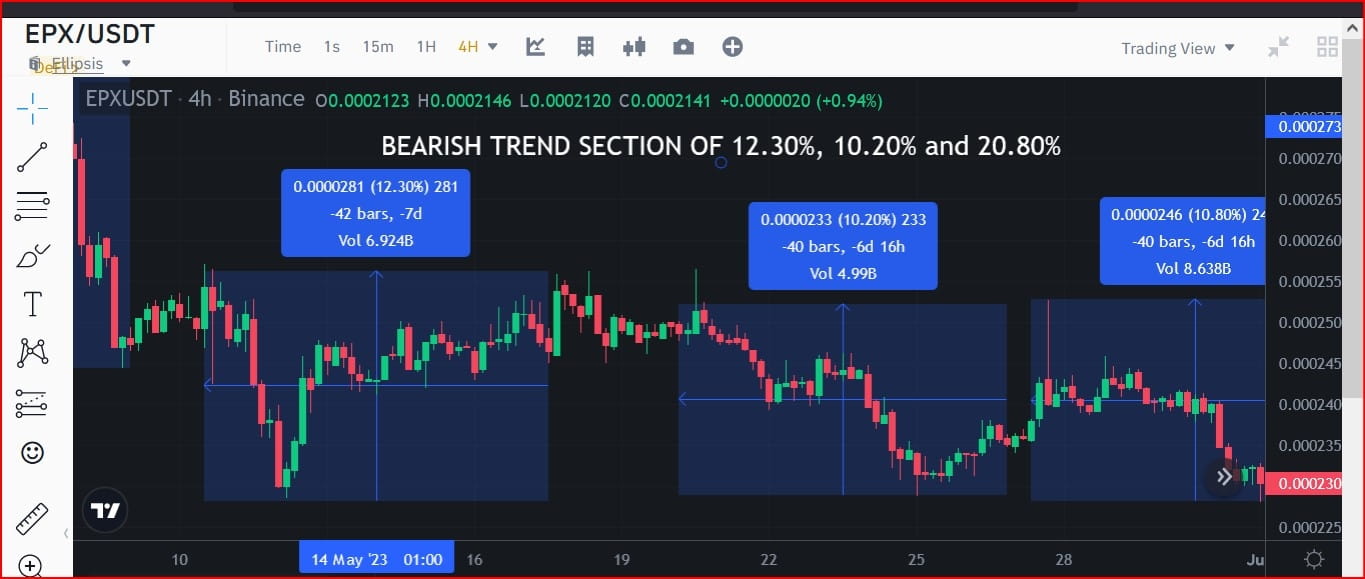Os dados do gráfico de preços de velas de qualquer par CRYPTOCURRENCY são divididos em seções de tendência de alta e seções de tendência de baixa.